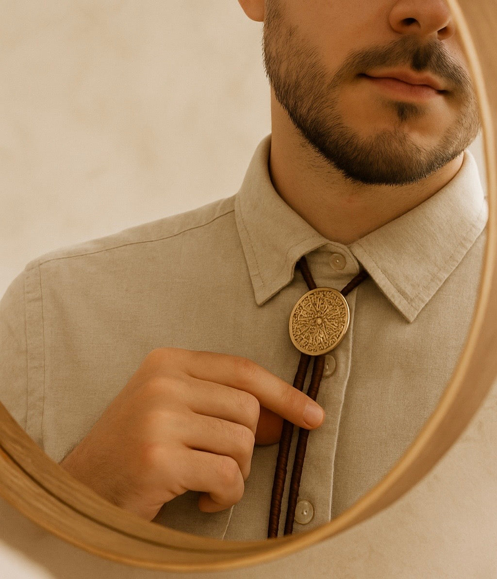 Botanical Bolo Tie β Hand-Engraved Brass on Braided Leather