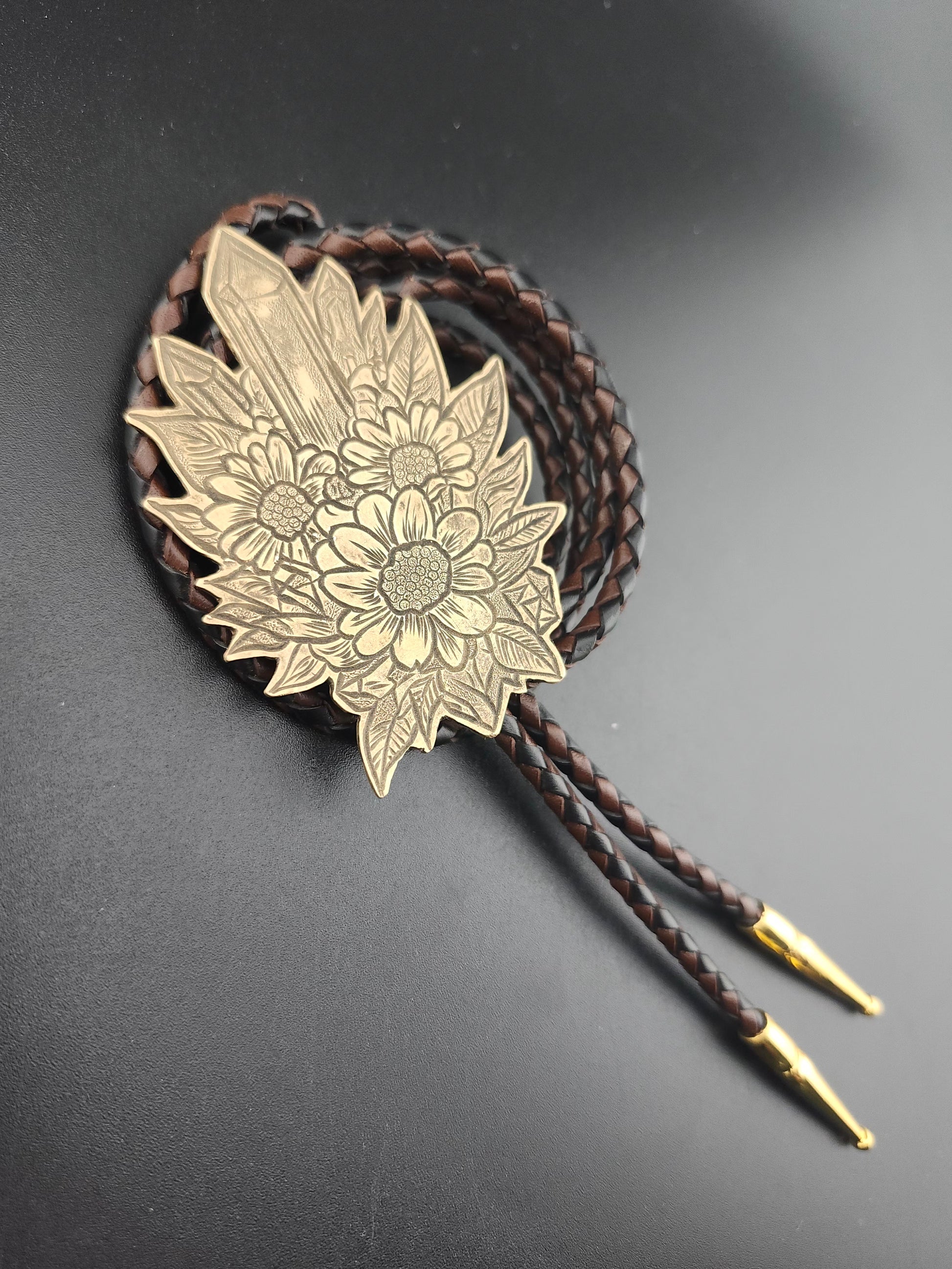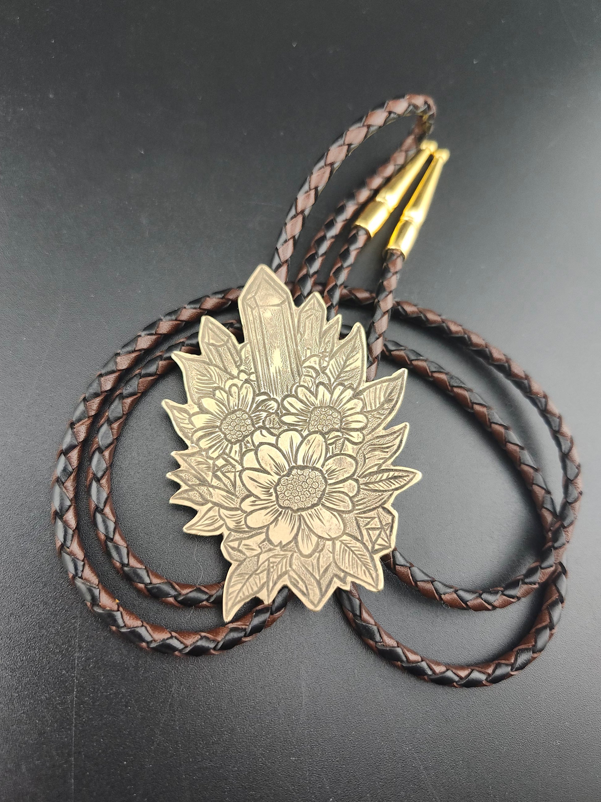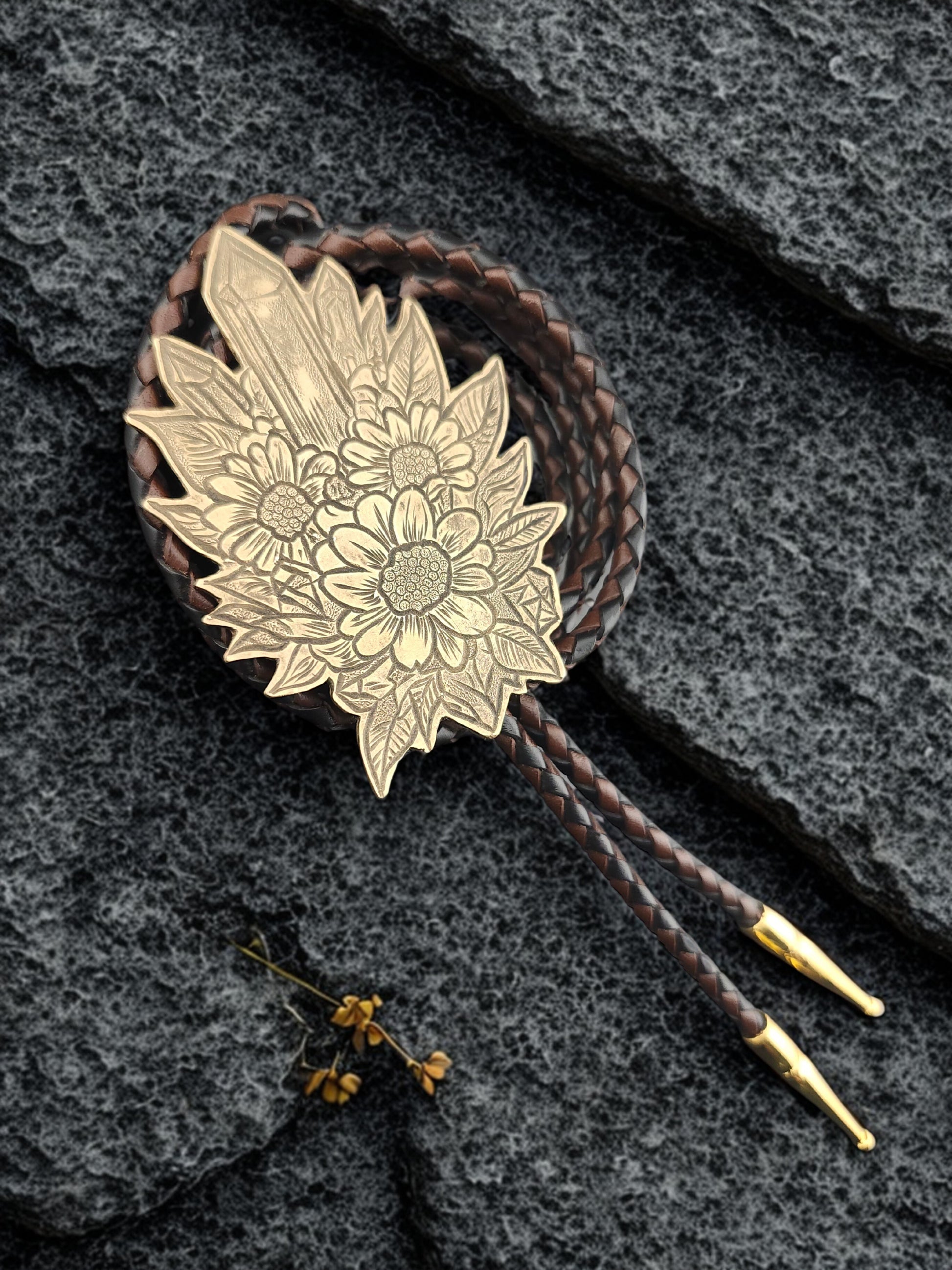 This botanical bolo tie features a hand-engraved brass centerpiece adorned with wildflowers and crystal formations. Inspired by natural growth and grounded energy, each design is engraved by hand, making every piece one-of-a-kind.