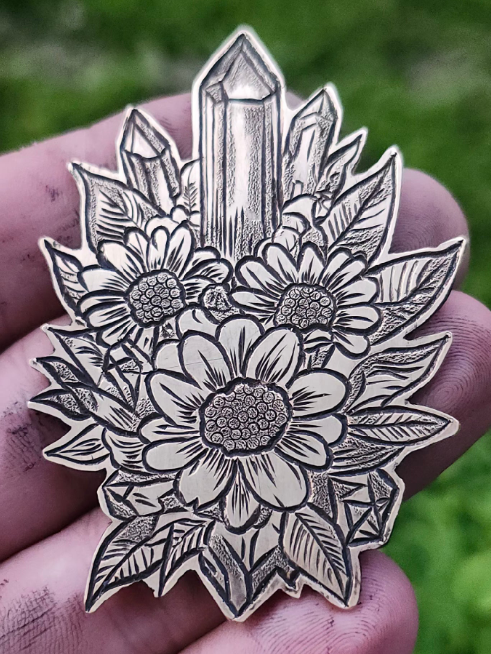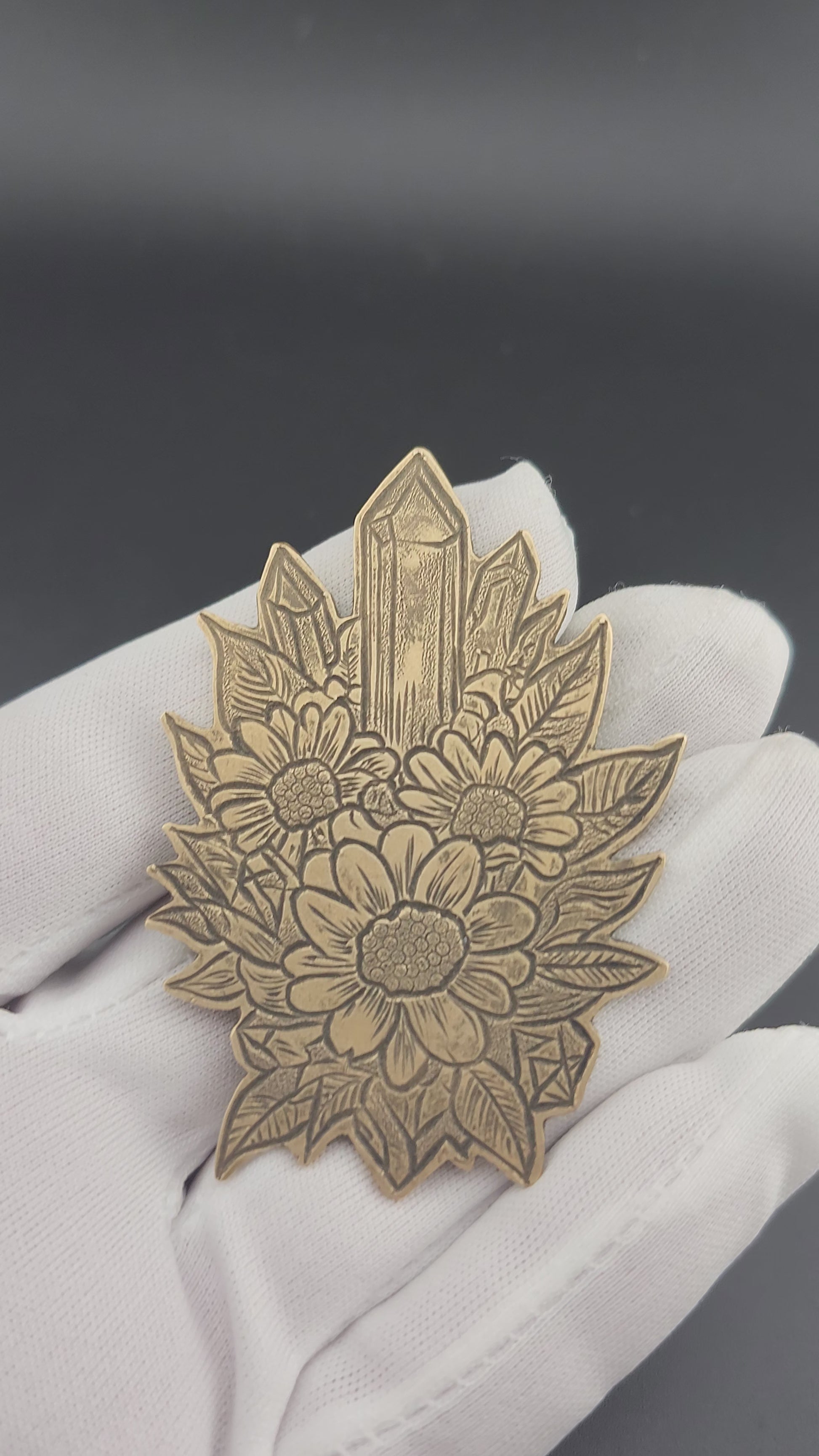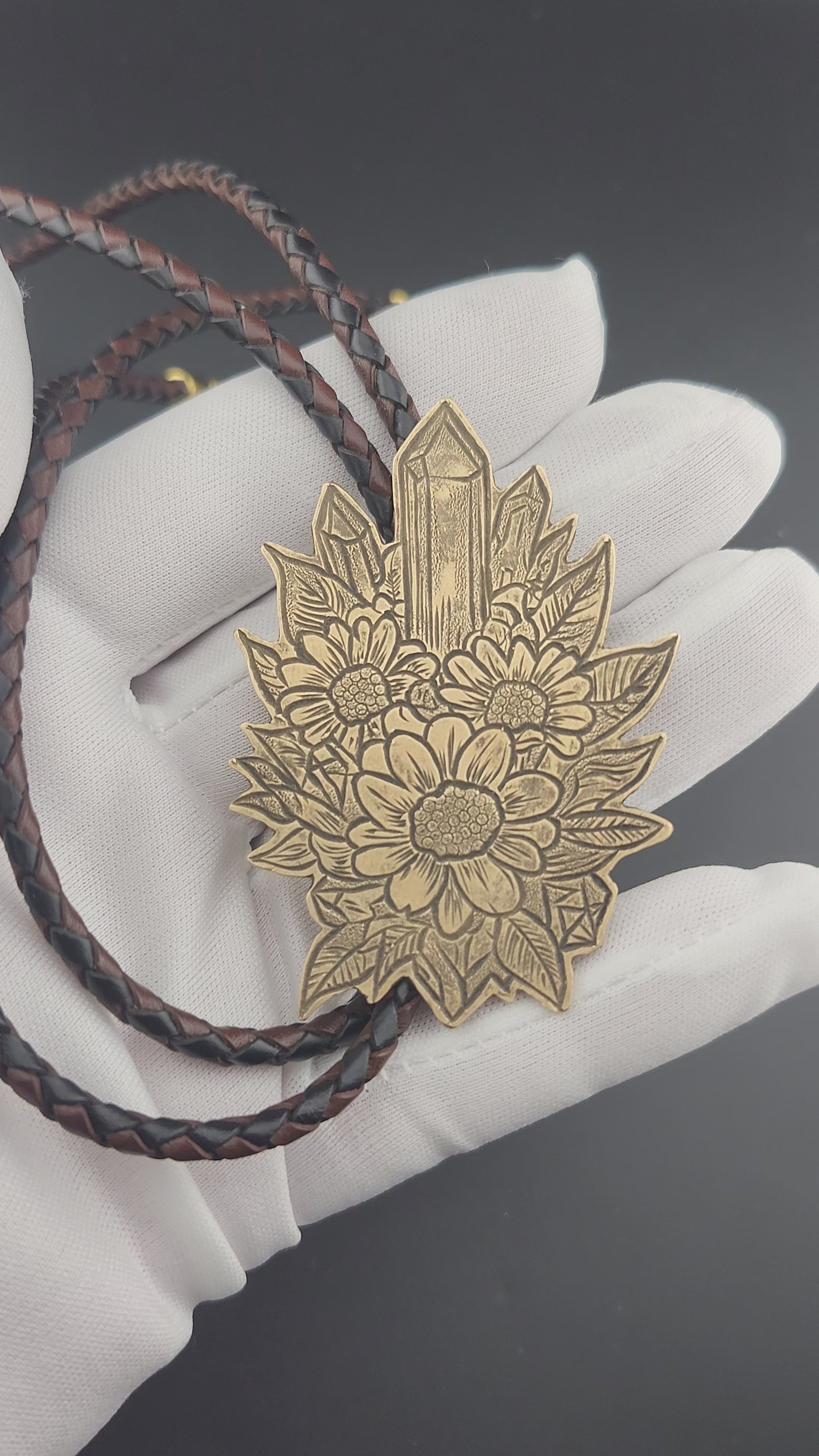 This botanical bolo tie features a hand-engraved brass centerpiece adorned with wildflowers and crystal formations. Inspired by natural growth and grounded energy, each design is engraved by hand, making every piece one-of-a-kind.
