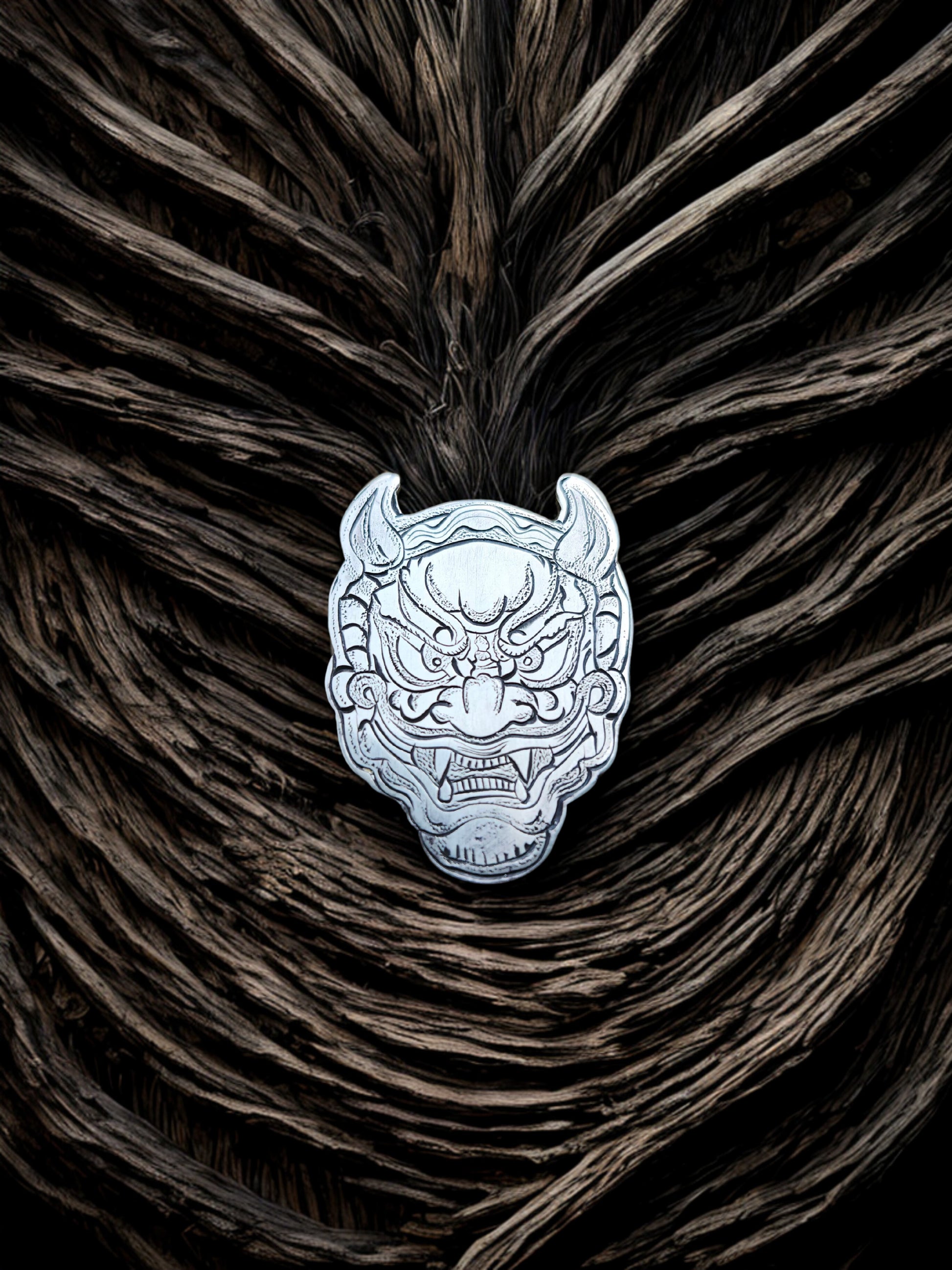 This one-of-a-kind pendant features a hand-engraved Oni mask — a fierce symbol of protection, rebellion, and inner fire. Carved entirely in solid sterling silver and finished with an oxidized polish to bring out the depth of each detail, this piece holds presence without saying a word.