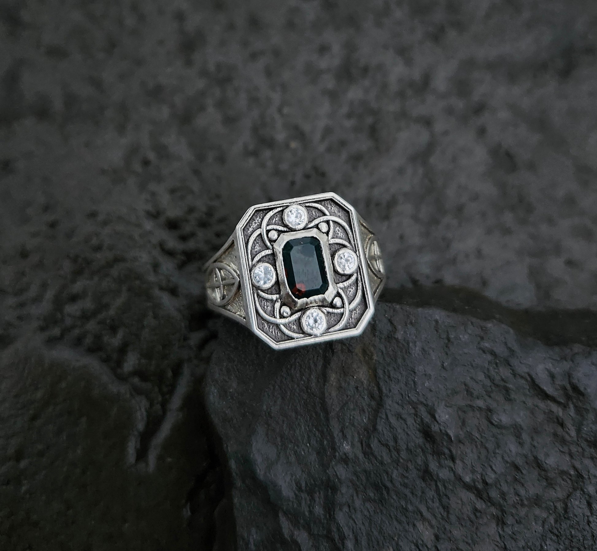 A natural bloodstone sits at the center — an octagon/emerald-cut hybrid — accented by white sapphires set by hand. Each stone pattern is unique, making every ring its own relic.