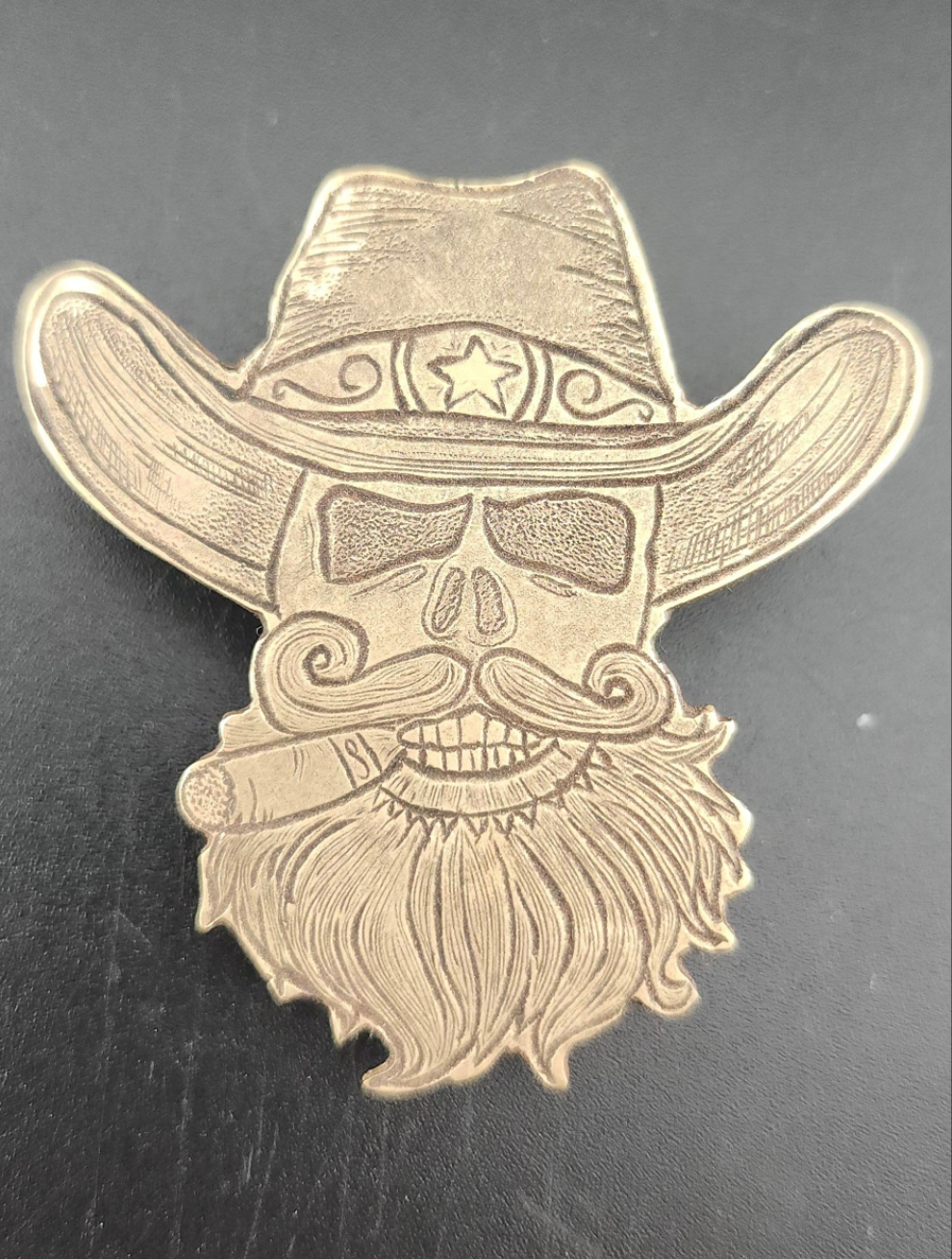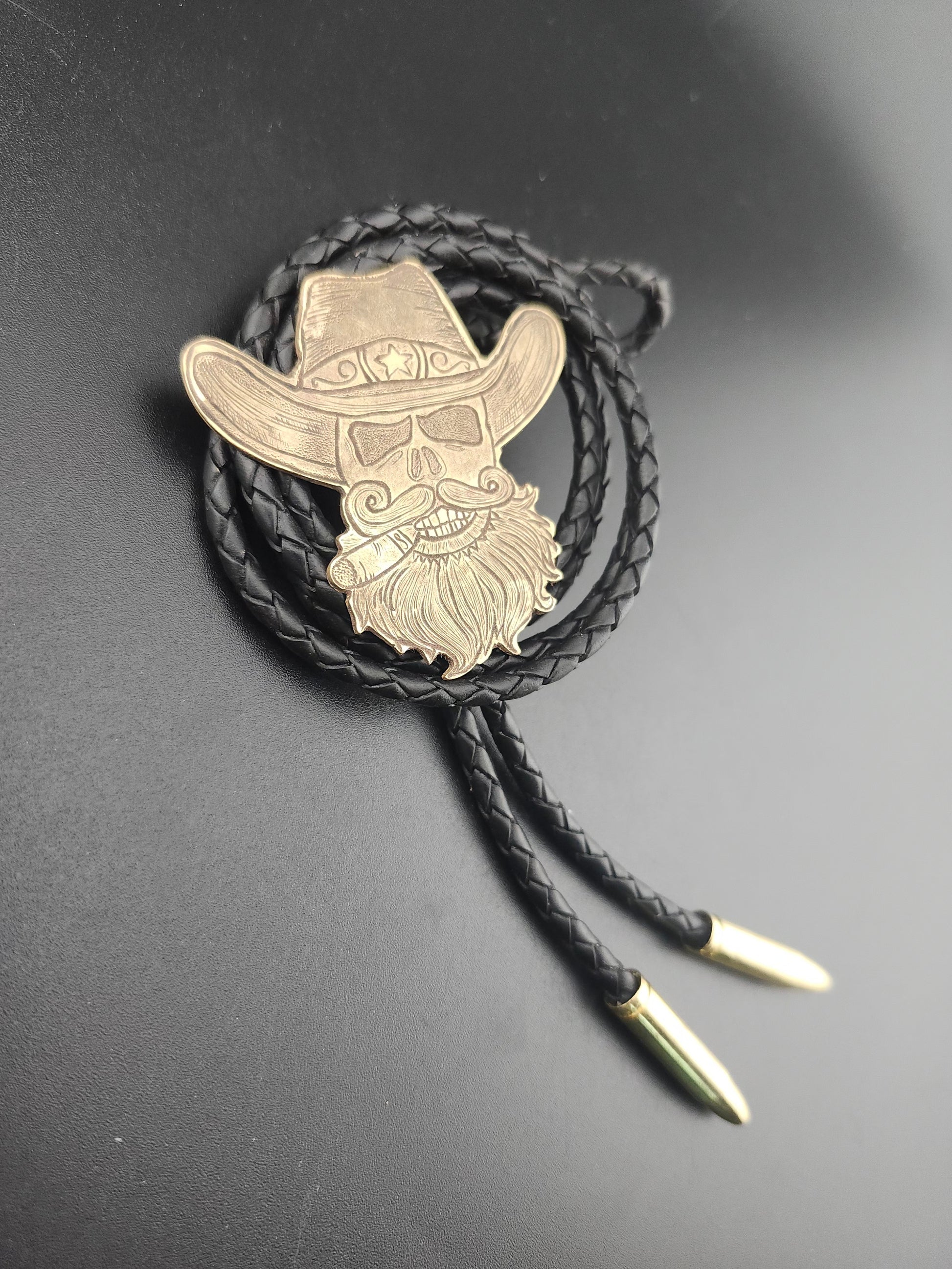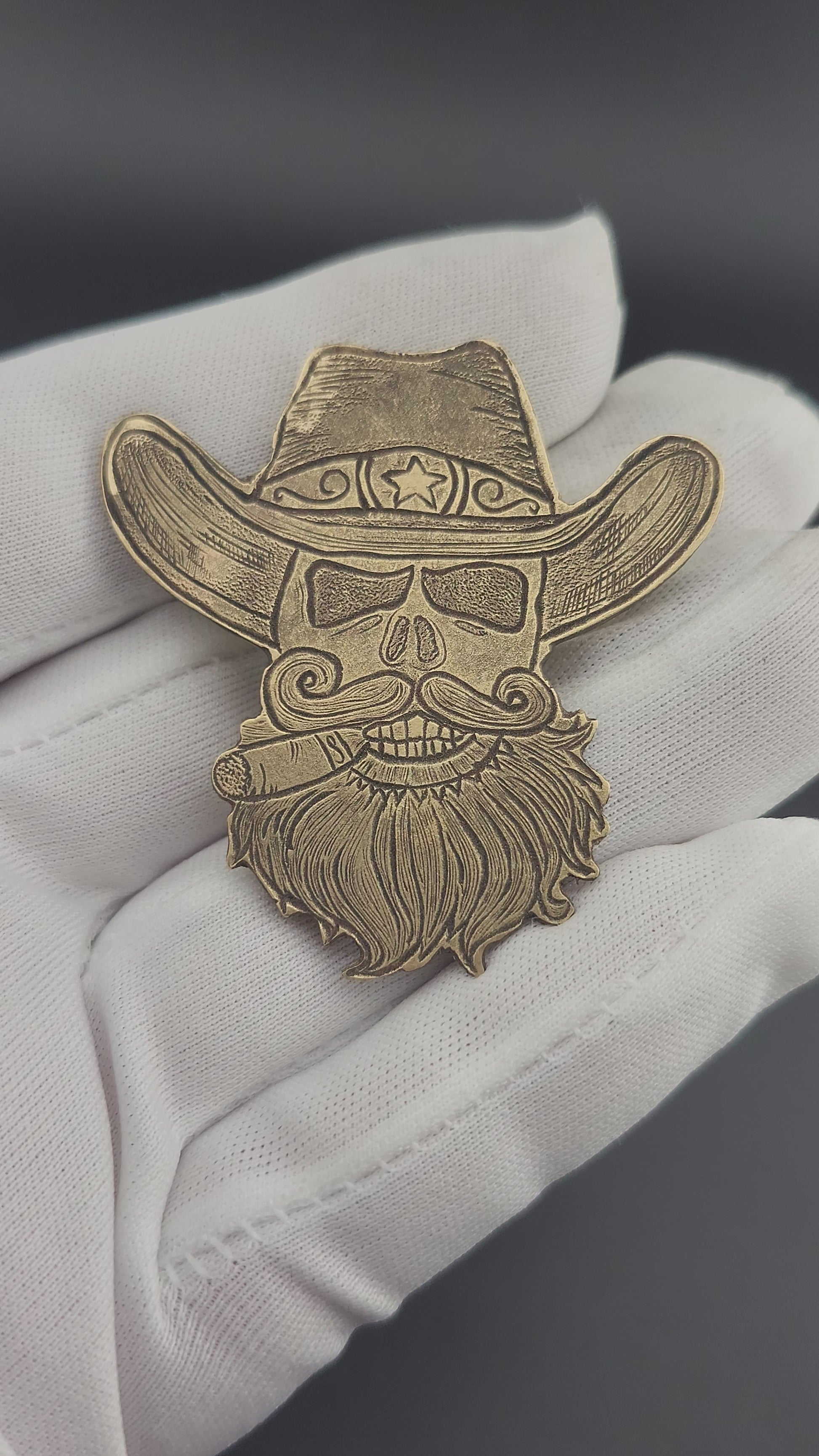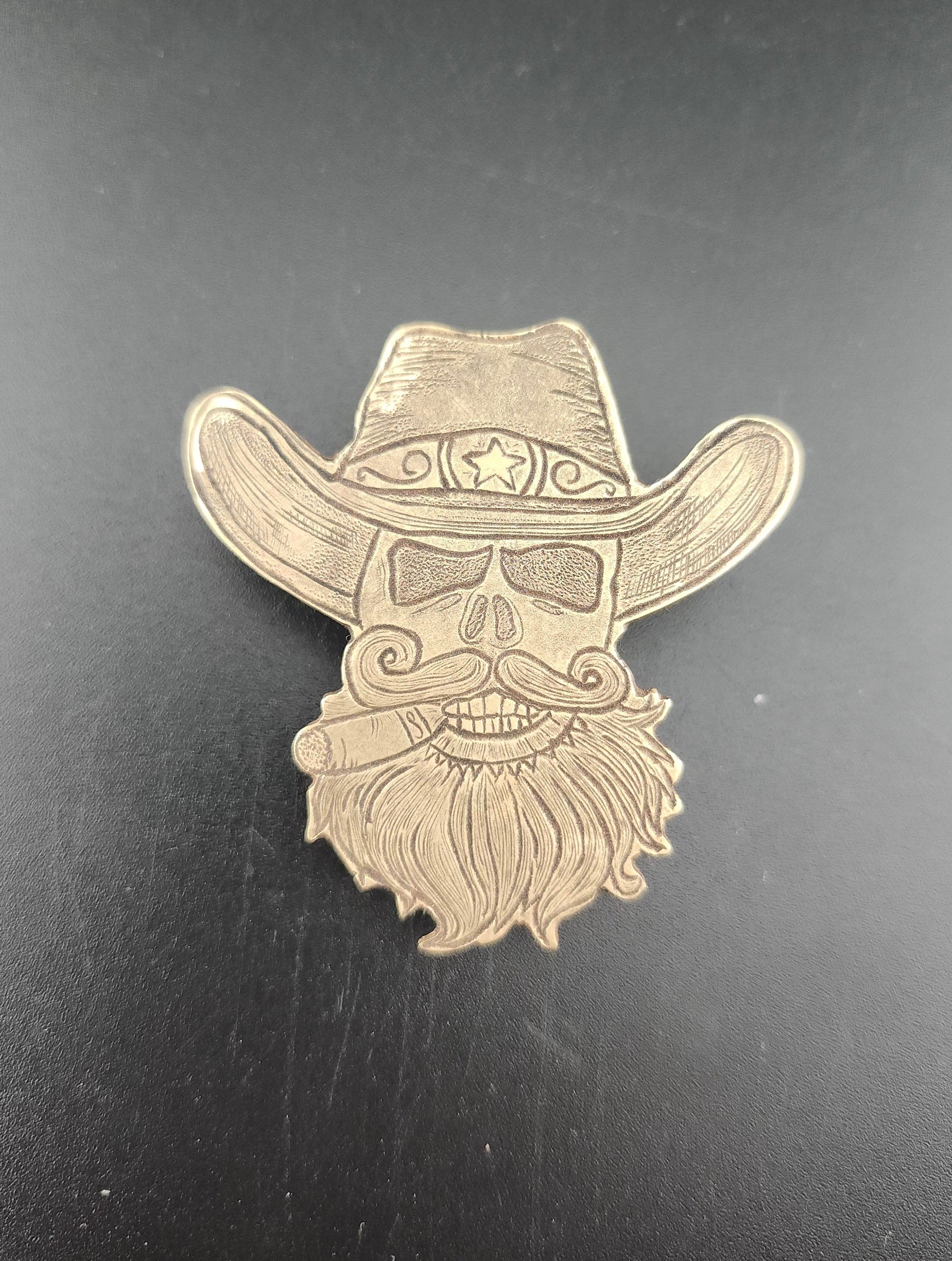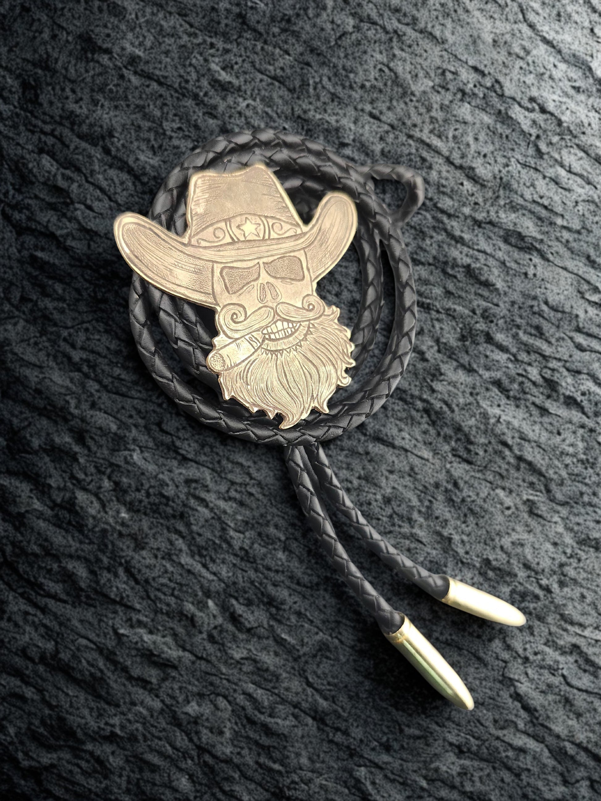 This bolo tie features a hand-engraved outlaw skull, complete with a wide-brimmed cowboy hat, curled mustache, and a half-smoked cigar clenched between grinning teeth. Every line was engraved by hand — no two are the same — making this piece a tribute to rebellion, grit, and a life lived on your own terms.